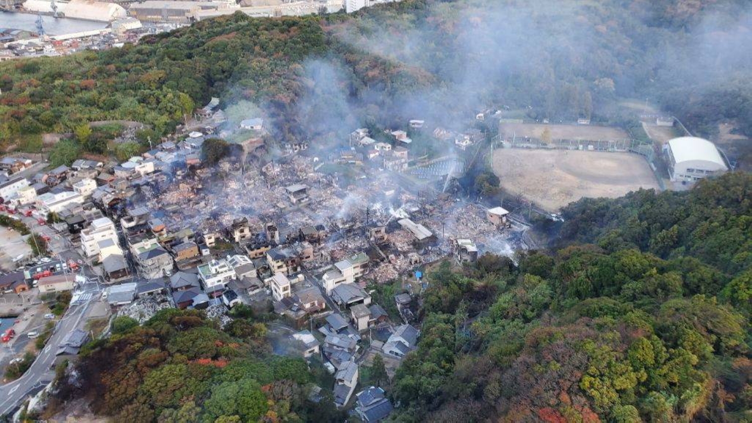 A large fire tore through a densely populated coastal district of the city of Oita on Tuesday evening, destroying more than 170 homes and shops and leaving one resident missing, according to local authorities. Fire crews were still working to bring the blaze under control as of Wednesday morning.