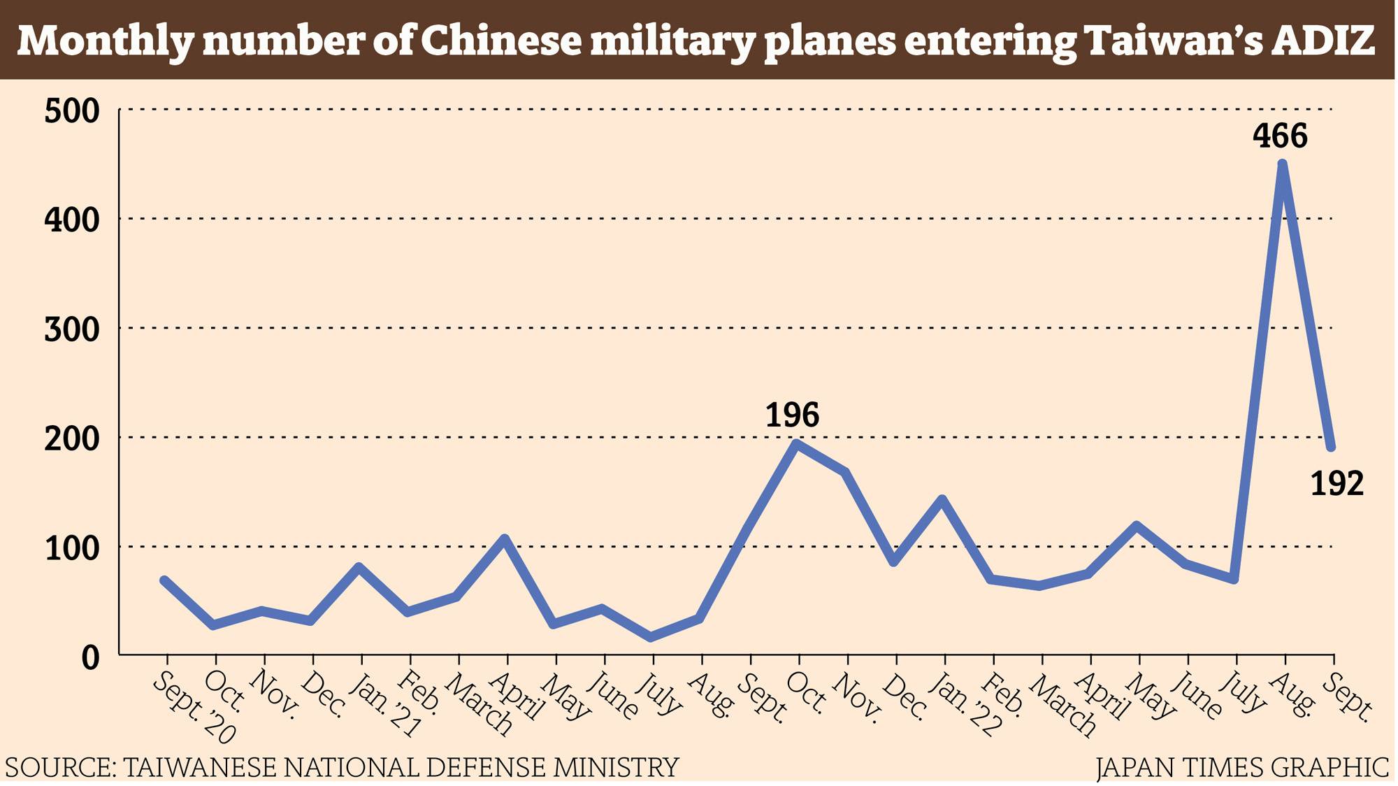 In August, Chinese warplanes entered Taiwan’s air defense identification zone, or ADIZ, a total of 446 times, greatly exceeding the previous monthly record high of 196 posted in October 2021.