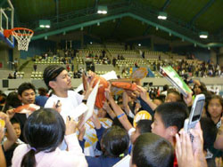 Takanori Goya, who plays for the expansion Toyama Grouses, is greeted by fans after Saturday's bj-league All-Star Game in Ginowan, Okinawa Pref. Goya, one of five Okinawan natives in the league, is quickly becoming a fan favorite. ED ODEVEN PHOTOS |