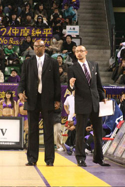 You'll see him on the sidelines of Tokyo Apache's games. He wears dark black suits and glasses and shaves his head just like the team's head coach, Joe Bryant, as if they're an object and its shadow, older brother and his younger brother, father and his son.