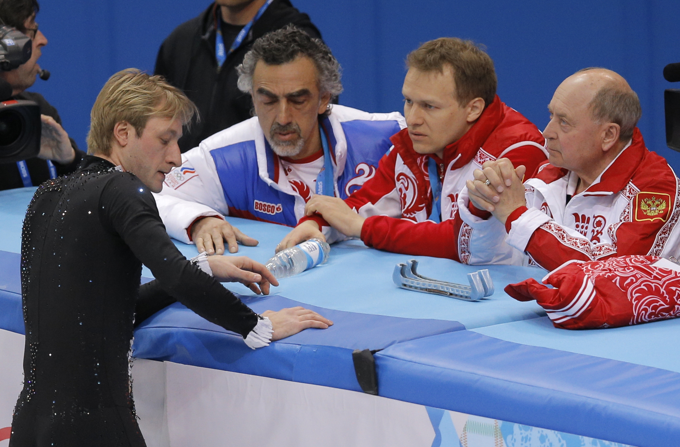 Plushenko, who helped lead the host nation to the gold medal in the team event, attempted a triple axel in the warmup but pulled out of it, then landed akwardly and was in obvious pain afterward.