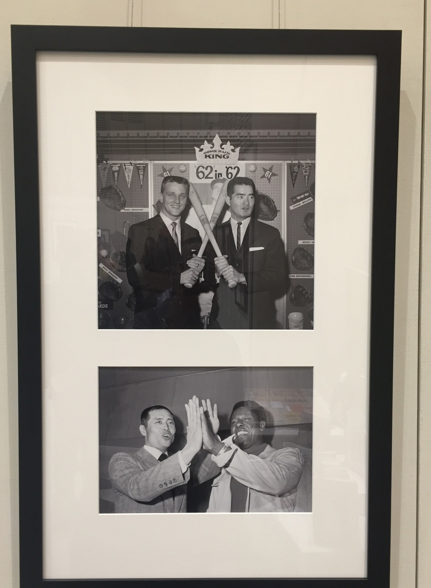 The exhibition is made up mostly of photos chronicling some of the cross-cultural history of the game between Japan and the United States. There were photos from an array of points in history. Some featured well-known greats, such as former Giants legend Shigeo Nagashima posing for a photo with the New York Yankees' Roger Maris in 1962, or Yankees great Joe DiMaggio giving hitting tips to some of the Hiroshima Carp during a visit to Japan while honeymooning with actress Marilyn Monroe in 1954.