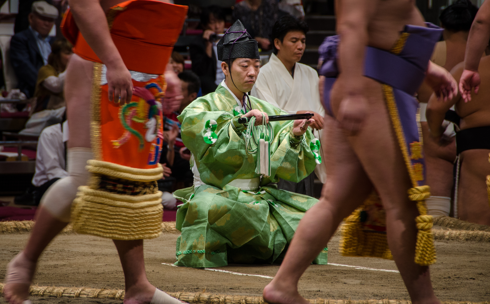 At least the wrestlers have the "comfort" of competing in only mawashi. The gyoji (referees) also have to run around the ring but in heavy kimono.