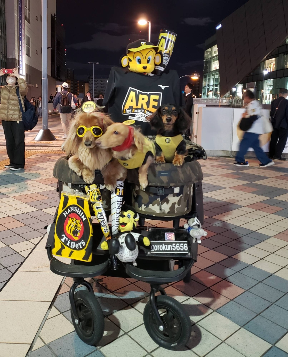 “Fans love to cheer for their team and everyone cheering together builds up that excitement,” says Takayoshi Hisadome, who visited Kyocera Dome Osaka prior to Game 1 on Saturday with his three dogs decked out in Tigers gear.
