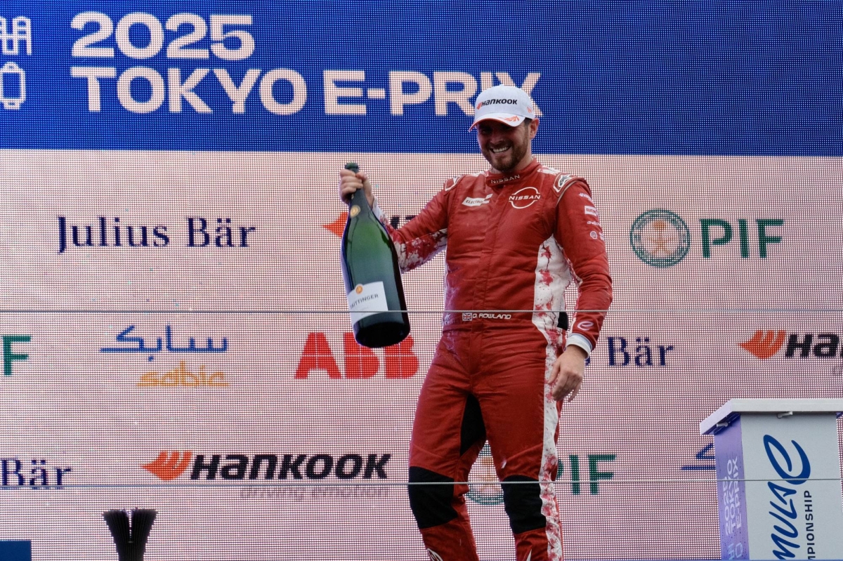 After finishing second in each of the first two Formula E races around Tokyo Big Sight, Nissan’s Oliver Rowland stepped to the top of the podium on Sunday in a thrilling Tokyo E-Prix.
