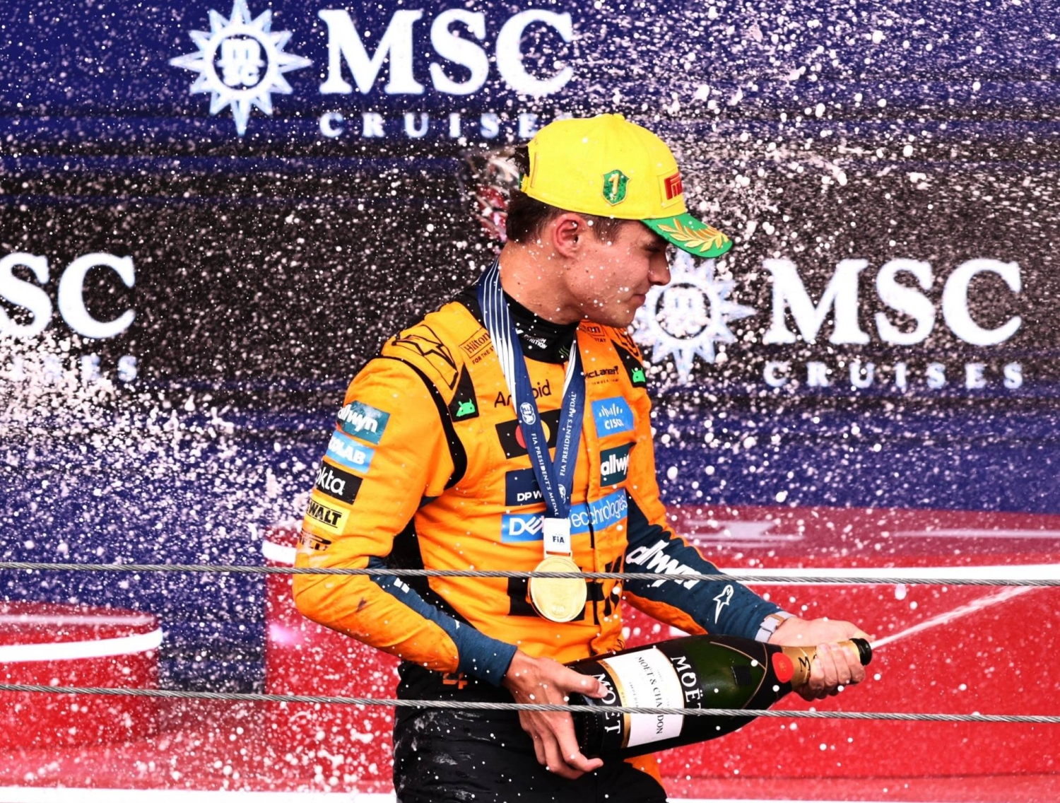 McLaren's Lando Norris won the Brazilian Grand Prix to surge 24 points clear in the Formula One championship race on Sunday, while teammate and title rival Oscar Piastri finished fifth after being penalized for causing a collision.